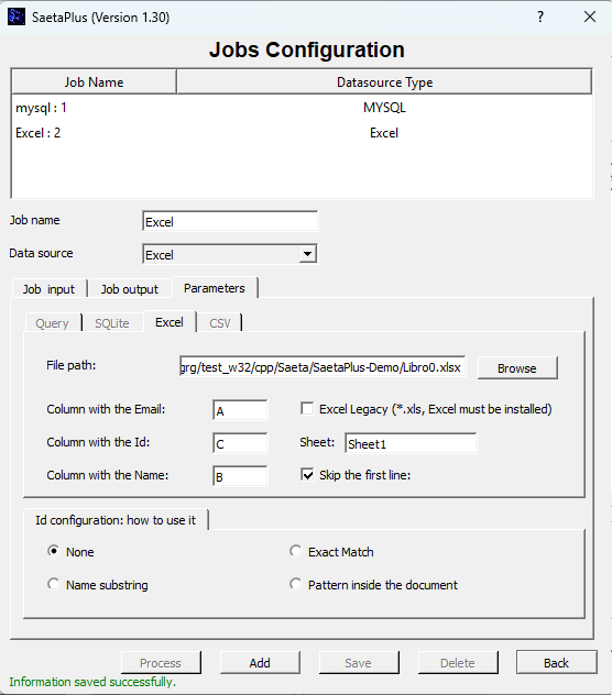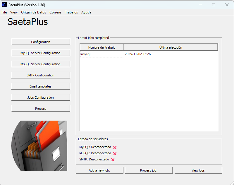 Finally, you must indicate the data source, which is where the mailing list is located. This can be in Excel, CSV, text file, a web page, a previously created mailing list, or an MSSQL, MySQL, or SQLite database.